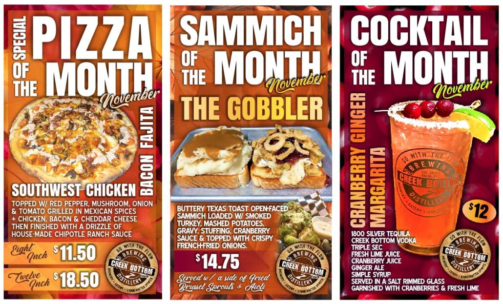 Specials of the month for November 2025 at Creek Bottom Brewing SAMMICH – The Gobbler! Celebrate Fall with this buttery Texas Toast open-faced sandwich loaded w/ smoked turkey, mashed potatoes, gravy, stuffing, cranberry sauce & topped with crispy French-fried onions – Thanksgiving Inspired & Delish! Served w/ a side of fried brussel sprouts & aioli...
