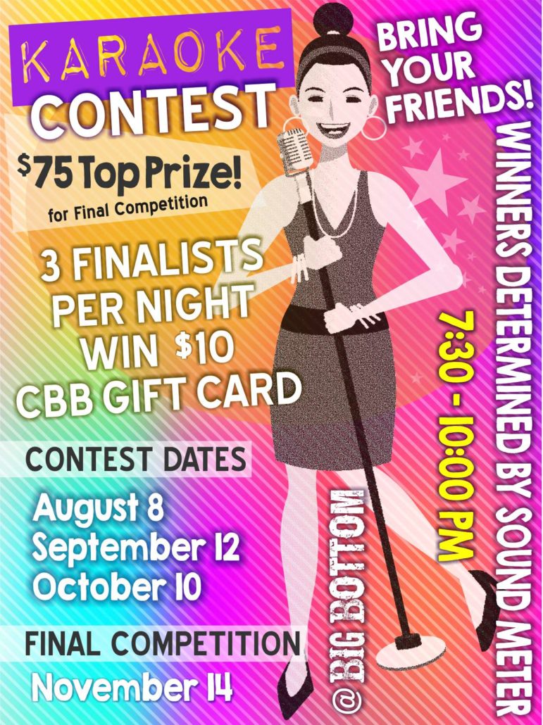 Big Bottom is kicking off a Karaoke Contest in August! There will be 3 months of competition, then the Big Karaoke Finals Party on November 14, 2019 where some lucky devil will win the TOP PRIZE of $75! Three winners each night will get $10 Creek Bottom Gift Cards during August, September and October too. Be sure to BRING YOUR FRIENDS because the winners are Determined by a Sound Meter!!!