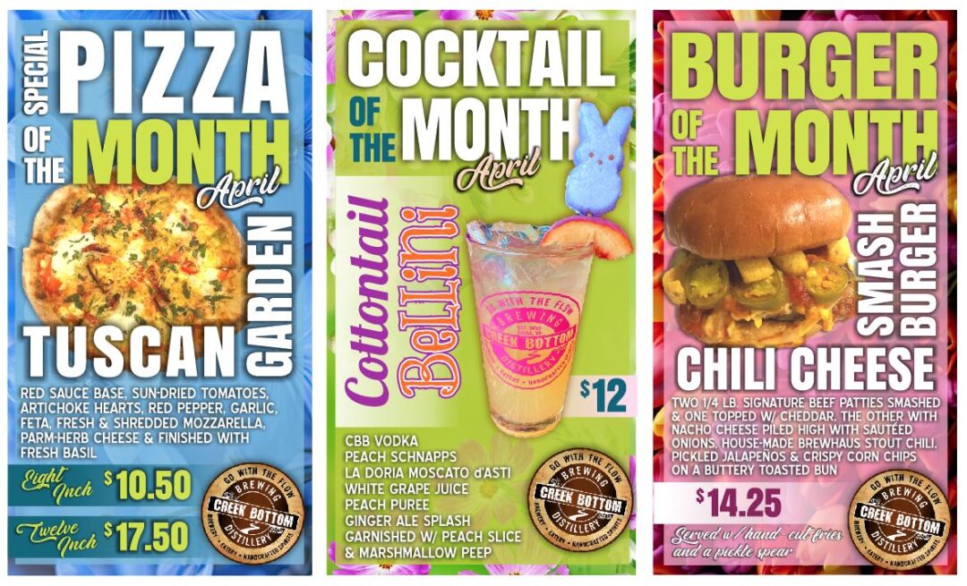 Specials of the month for April 2026 at Creek Bottom Brewing