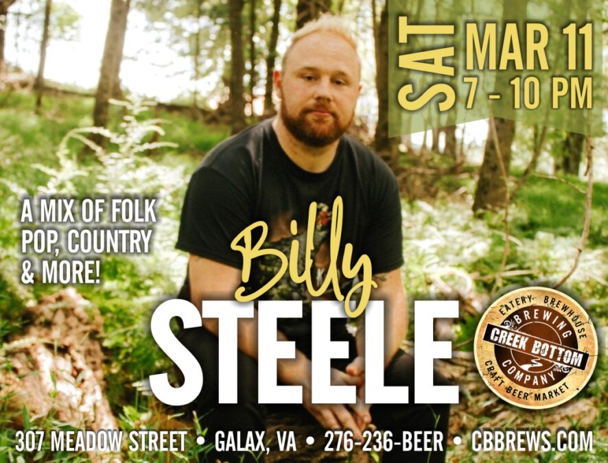 Come out for some mixed genre melodies from Billy Steele, on Sat, Mar 11 from 7-10 at Creek Bottom Brewing in Galax, VA. He plays a mix of folk, roots, pop, alternative and country for your listening pleasure!