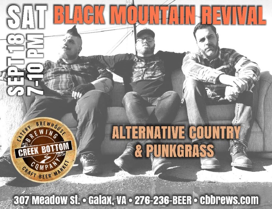 Mosey on down to Creek Bottom Brewing on Sat, Sept 18 from 7-10 to take a gander at Black Mountain Revival. Enjoy an evening of alternative country and punkgrass music with the Brew Crew at the Bottom!