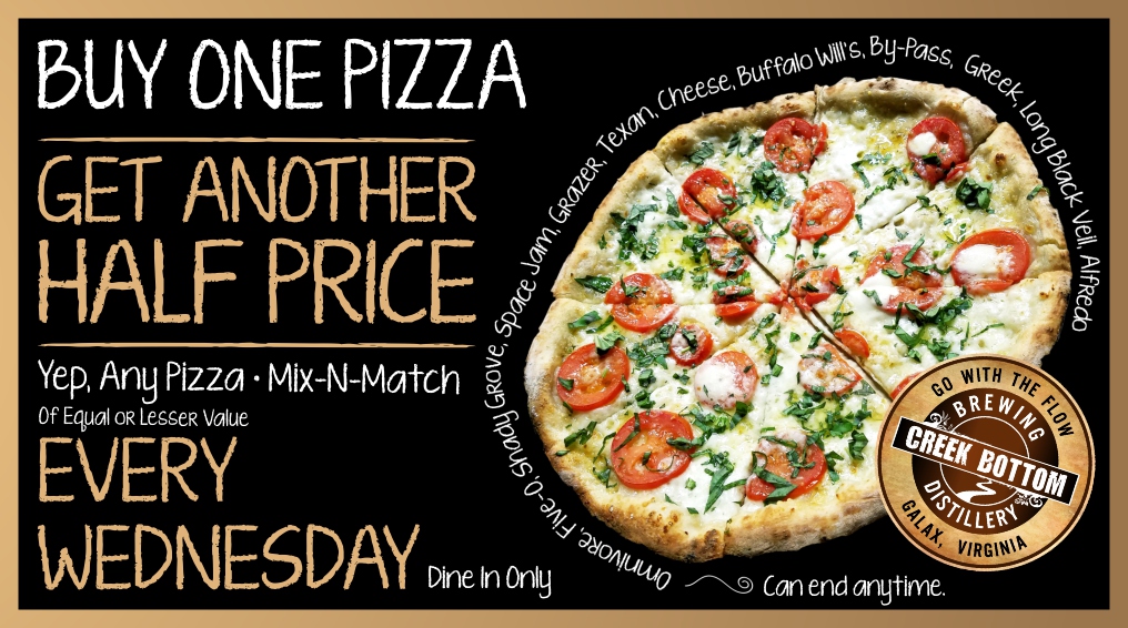 Buy One Pizza, Get One ½ Price Every Wednesday at Creek Bottom Brewing! Choose from our house specialty pizzas or build your own pie.