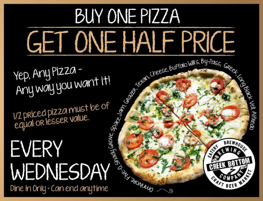 Every Wednesday Buy One Pizza, Get One Half Price! You can get creative and mix em’ up however you’d like.