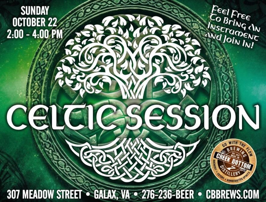 Creek Bottom Brewing is hosting a Celtic Session on Sunday, Oct. 22 from 2-4 pm. Bring an instrument and join in on the fun! Or, sit back with a cold bevvy, some great eats and just enjoy the show.