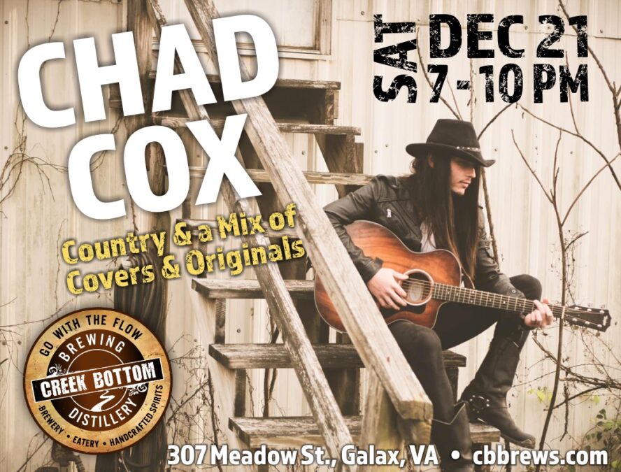 Lay eyeballs on Chad Cox at Creek Bottom Brewing on Sat, Dec 21 from 7-10 pm. Although his main genre is country, his love for all music shows in his diverse selection of both covers and original songs.