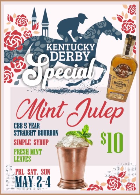 It’s gonna be a festive weekend at The Bottom! Sip on a craft Mint Julep cocktail for only $10 made with Creek Bottom’s 5 year Straight Bourbon Whiskey in honor of the Kentucky Derby. Cocktail special good all day Friday, Saturday & Sunday (May 2-4).