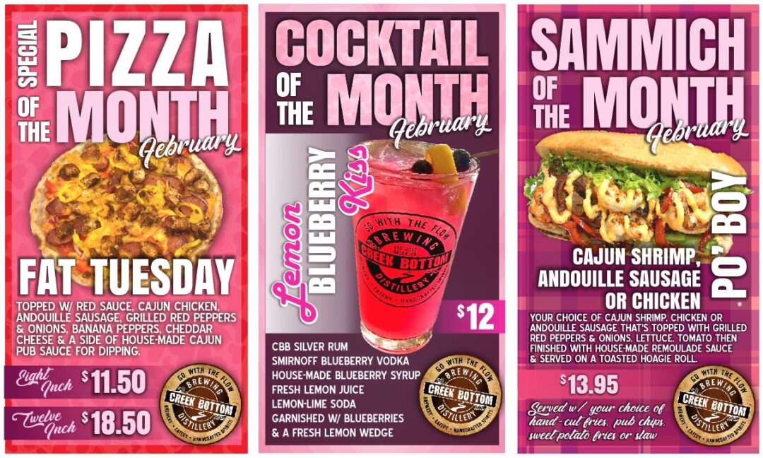 Specials of the month for February 2025 at Creek Bottom Brewing