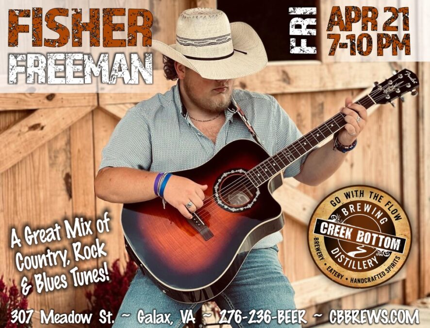 Fisher Freeman will be live at Creek Bottom Brewing on Fri, April 21 from 7-10 pm. Bringing a great mix of country, rock & blues tunes straight out of NC! Enjoy a cold brew, a straight pour of local bourbon and some delicious grub ALL at CBB!