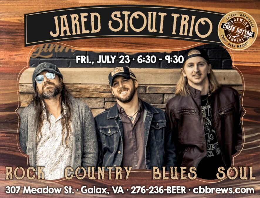 Come out to Creek Bottom Brewing on Fri., July 23 from 6:30 – 9:30 to see The Jared Stout Trio play a versatile mix of Americana blended with Blues, Country, Soul and Rock.
