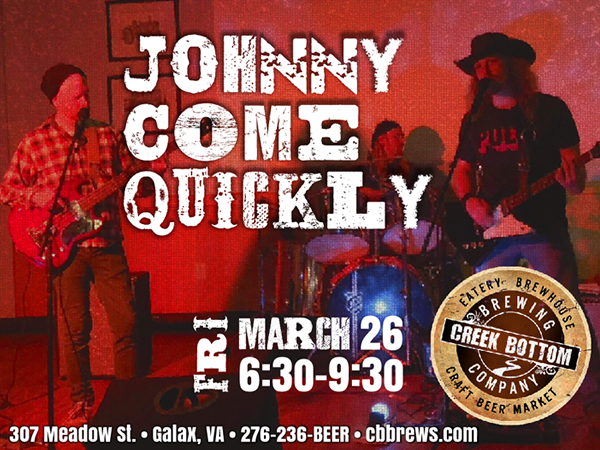 LIVE MUSIC with Johnny Come Quickly!!! Come eat the best brick oven pizza and wings around and listen to a rockin show! These guys sure do put on a entertaining event, so come on down to the Bottom. Show starts at 6:30 pm.
