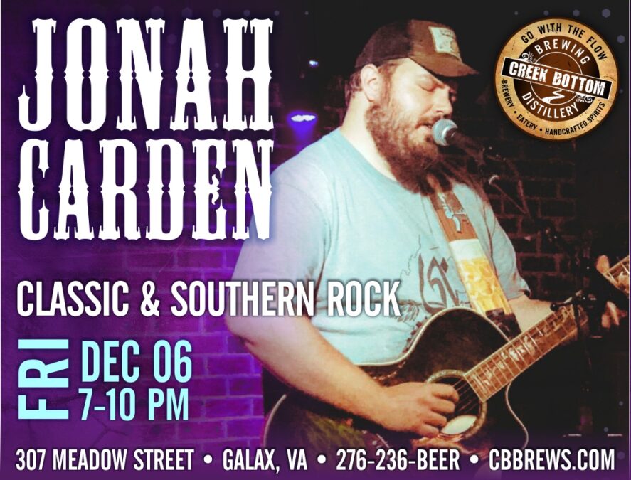 Jonah Carden live at Creek Bottom Brewing on Fri, Dec 6 from 7-10. Dine to the tunes of some bluesy classic and southern rock. Life ain’t so bad down at The Bottom!