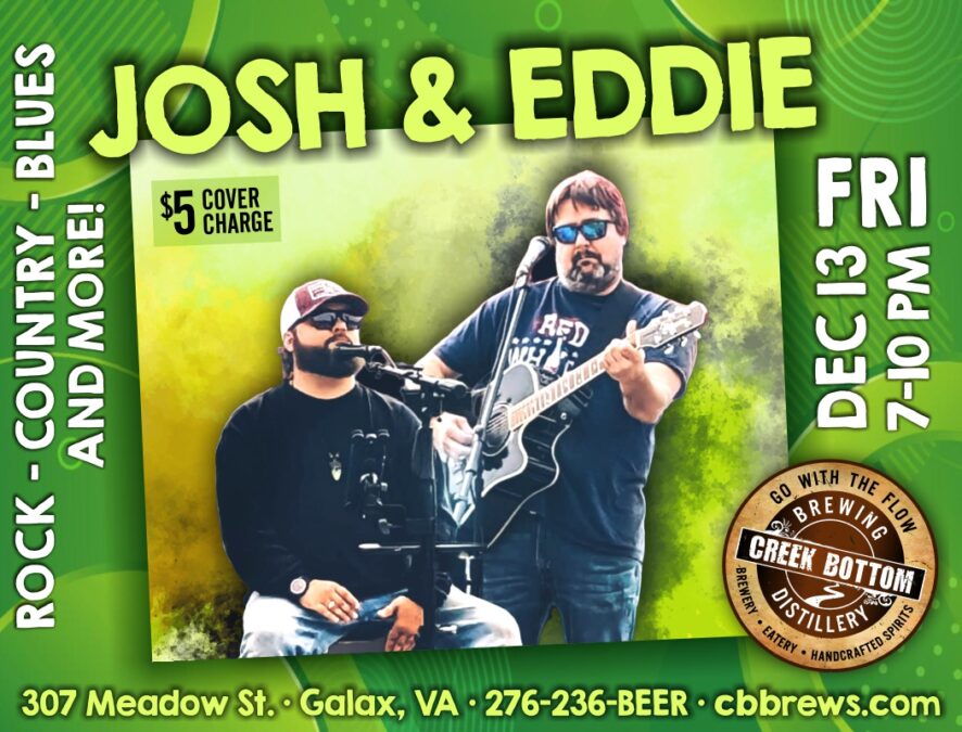 Josh & Eddie will be live at Creek Bottom Brewing on Fri, Dec 13 from 7-10 pm. These guys play a variety of songs ranging from 90s Rock & Classic Rock, to Blues, Sing-a-long Country hits and everything in between. Gonna be a great show, some come on down and blow the suds off a few at The Bottom! $5 Cover.