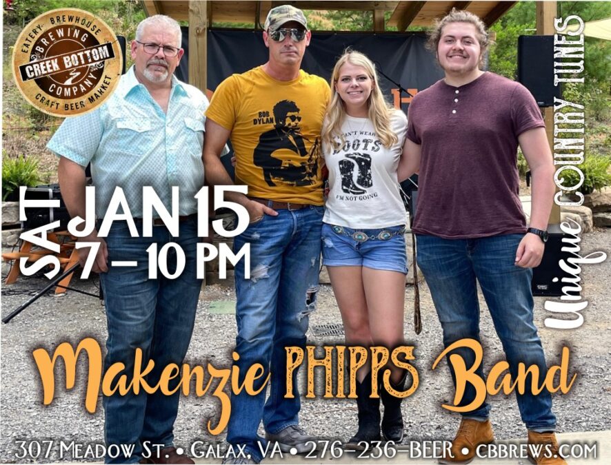 The Makenzie Phipps Band will be performing live at Creek Bottom Brewing on Sat, Jan 15 from 7-10 with their unique southern style that adds a flare of soul to their country sound.