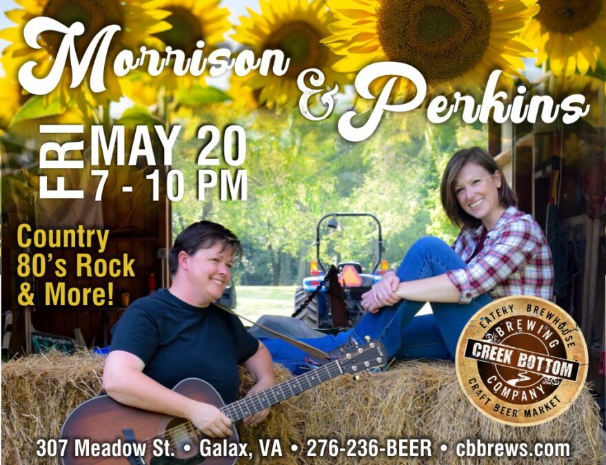 Morrison & Perkins will be live at Creek Bottom Brewing on Fri, May 20 from 7-10. They are an awesome cover band duo, playing songs ranging from country to eighties rock and more. Let’s welcome them Bottom-Style!