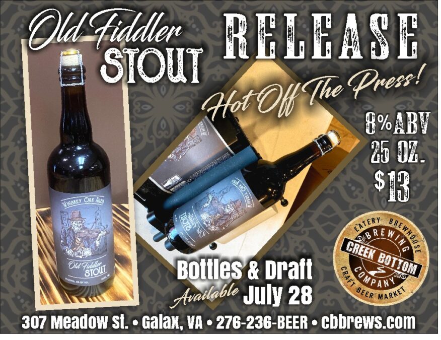 In honor of the Old Fiddler’s Convention, Creek Bottom Brewing is releasing a new brew! Old Fiddler Stout will make it’s appearance on Thursday, July 28. This deliciousness will be available in 25 oz. bottles for $13 and on draft at the restaurant. Enjoy notes of freshly-brewed java, light oak and bourbon in this medium-bodied stout.