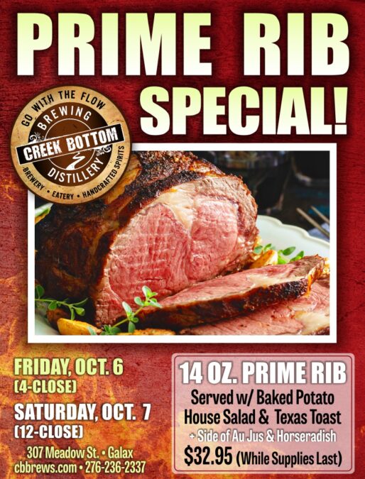 Welcome Fall with Creek Bottom Brewing’s Prime Rib Special Fri, Oct 6 (starts 4 pm) & Sat, Oct 7 (starts 12 pm). Enjoy 14 ounces of Prime Rib served with a baked potato, house salad & buttery Texas toast plus a side of Au Jus & Horseradish. All of this deliciousness for only $32.95.