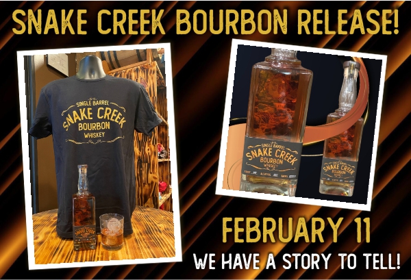 Join us at Creek Bottom Brewing, Distillery & Restaurant on Wed, Feb. 11 (all day) for the eagerly anticipated release of Snake Creek Single Barrel Bourbon. The first 25 bottles sold come with a custom Snake Creek logo-engraved rocks glass! Plus, the first 25 people to purchase are automatically entered to win a metallic logo Snake Creek Bourbon front, Creek Bottom back t-shirt (1 entry per person present). Mark your calendar!