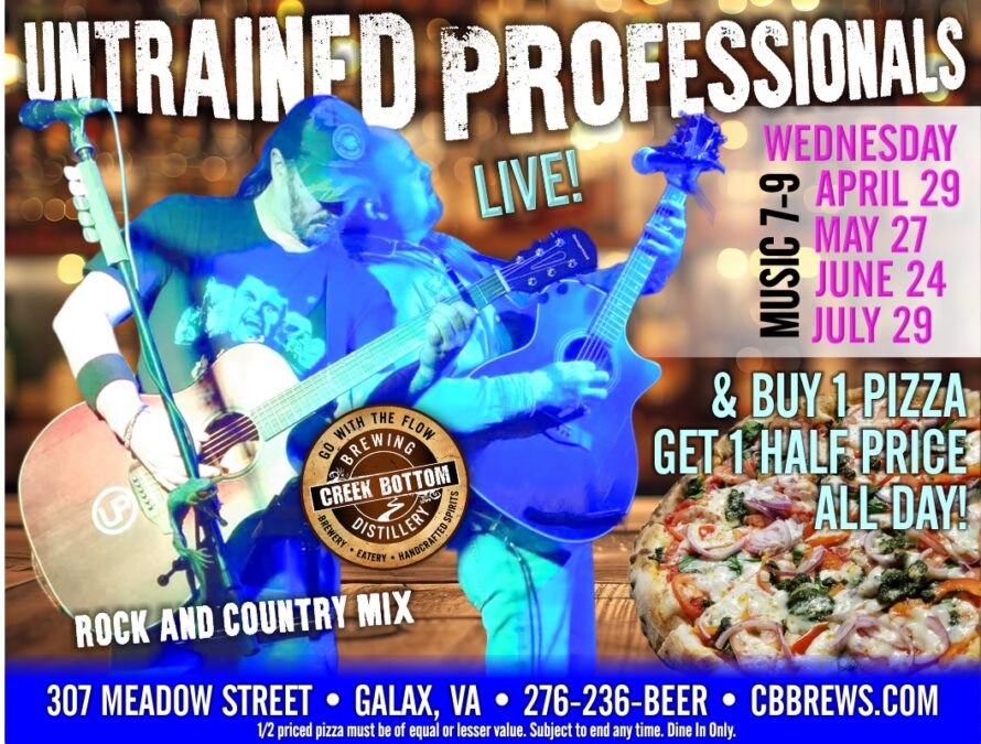 Wednesday night LIVE MUSIC is back at Creek Bottom Brewing! The Untrained Professionals (featuring Clinton Scott & Chris Huddle) are bringing their high-energy, crowd-pleasing sound to the stage the last Wednesday of each month from 7-9 pm! Expect a mix of feel-good rock & country tunes and fun times!