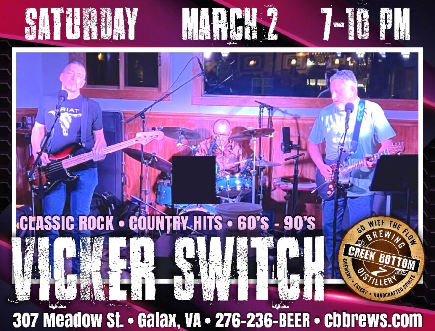 Vicker Switch onstage at Creek Bottom Brewing on Sat, March 2 from 7-10 pm. They’ll serenade you with some classic rock & country hits from the 60s through the 90s. Come on out and join us for a great night of music and fun!