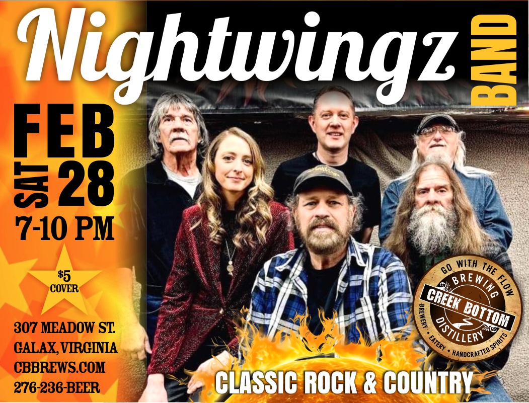 Nightwingz Band will be live at Creek Bottom Brewing on Sat., Feb 28 from 7-10 pm. This sixsome hailing from the New River Valley throws out a great mix of classic rock & country awesomeness. Enjoy their rhythm, eat great grub & drink happy drinks down at The Bottom in Galax, VA! A $5 cover...