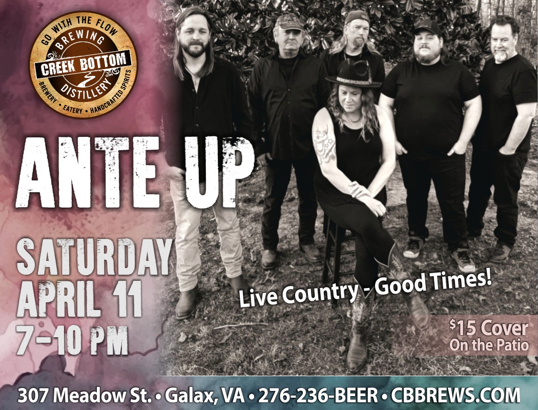Ante Up is bringing the full house to Creek Bottom Brewing on Sat, April 11 from 7 – 10 pm! This 6-piece country band is hitting the stage with big sound, high energy, and all your favorite country hits. Bring your crew, grab a drink & some grub and get ready for a night that...
