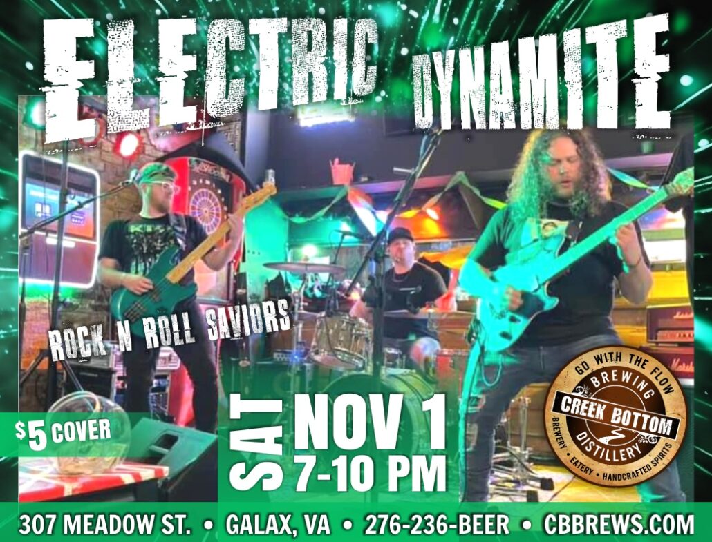 Creek Bottom Brewing welcomes Electric Dynamite to the stage on Sat, Nov 1 from 7-10 pm. Jam with these guys who are dubbed the Rock-n-Roll Saviors! Enjoy a night out to relax & unwind with your favorite CBB fare & a cold craft beverage…you deserve it! $5 Cover.