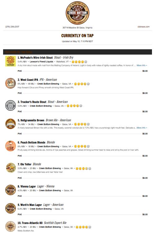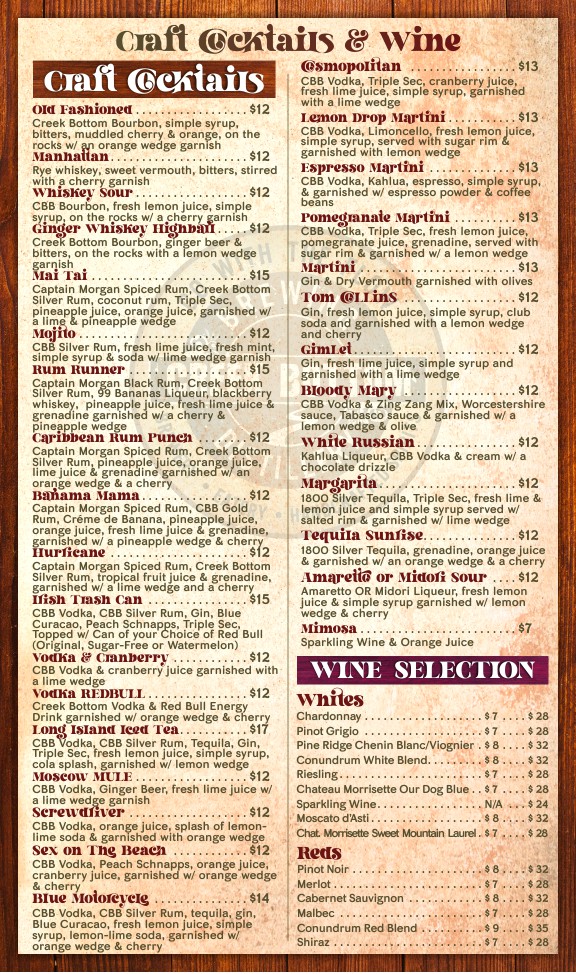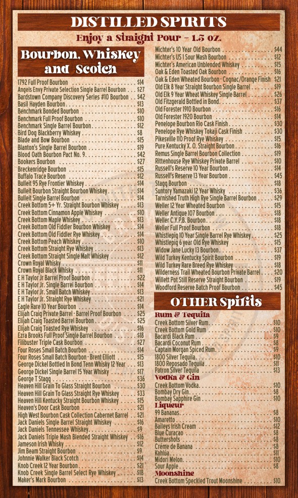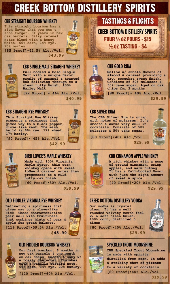 Creek Bottom Brewing, Restaurant & Distillery Menus Lunch / Dinner Menu CLICK FOR THE LUNCH & DINNER MENU Cocktail & Wine Menu CLICK FOR THE COCKTAIL & WINE MENU CBB Spirits & Tasting Menu CLICK FOR THE CBB SPIRITS & TASTING MENU Beer on Tap Menu CLICK FOR THE BEER ON TAP MENU Distilled Spirits & Bourbon Menu CLICK FOR THE DISTILLED SPIRITS& BOURBON MENU
