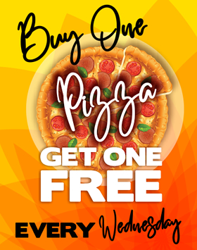 BOGO Pizza at Creek Bottom every Wednesday – both locations! All day at Lil’ Bottom, and at Big Bottom after 4PM: buy a delectable sizzling brick oven pizza and get the second absolutely FREE! Dine in only, but of course you can take the second home! Remember, 7 days without pizza makes one weak – bahaha!
