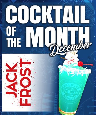 December’s cocktail of the month at Creek Bottom Brewing & Distillery is Jack Frost! A crisp and refreshing blend of Blue Curacao, Coconut Rum, Creek Bottom Silver Rum, Cream of Coconut, Pineapple Juice & Lemon-Lime Soda. Then Rimmed w/ a Mix of Sprinkles & Coconut + Garnished w/ a Maraschino Cherry & Festive Holiday Peeps.