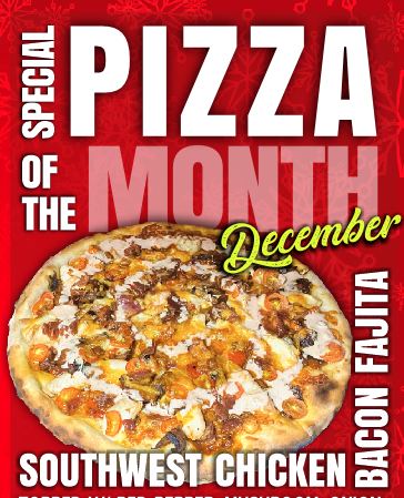 The pizza of the month for December 2024 is the Southwest Chicken Bacon Pizza! Enjoy a delicious brick oven pizza topped w/ red peppers, mushrooms, onions & cherry tomatoes that are grilled in Mexican spices + chicken, bacon & cheddar cheese. The pizza is finished with a drizzle of house-made chipotle ranch sauce. Yum-O!