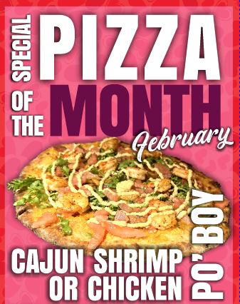 The pizza of the month for February 2024 is the The Cajun Shrimp or Chicken Po’ Boy Pizza! Enjoy a delicious brick oven pizza topped w/ your choice of Cajun shrimp or chicken + roasted red peppers, caramelized onions, andouille sausage & cheddar cheese. The pizza is finished with lettuce, tomato & a drizzle of house-made remoulade sauce.