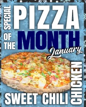 The pizza of the month for January 2025 is the Sweet Chili Chicken Pizza! Enjoy a delicious brick oven pizza topped w/ grilled chicken, mozzarella cheese, pineapple, pickled onion, Pico de Gallo, drizzled with sweet chili sauce and garnished with scallions. Yum-O!