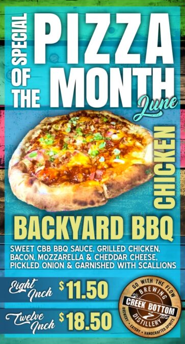 June’s pizza of the month at Creek Bottom Brewing & Distillery is the Backyard BBQ Chicken Pizza! Enjoy a brick-oven made pizza with sweet CBB BBQ sauce, grilled chicken, bacon, mozzarella & cheddar cheese, pickled onion & garnished with scallions. Let’s kick off summer the tasty way!