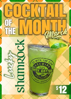 The March cocktail of the month at Creek Bottom Brewing & Distillery is The Lucky Shamrock! A charmed mix of CBB vodka, Midori Melon Liqueur, Triple Sec. pineapple juice, fresh lime juice, lemon-lime soda & garnished w/ a fresh pineapple slice & lime wedge.