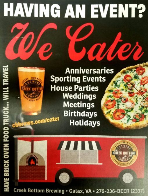Creek Bottom can be the coolest caterer for your event with a wood fired oven and beer on our food truck! ORRRR rent out a catered spot at our restaurant location on Country Club Lane!