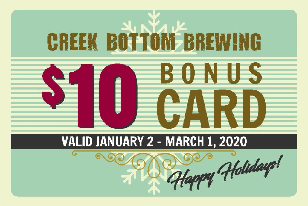 Between Nov. 14 – Dec. 24, 2019, for every $50 in Creek Bottom Brewing gift cards you purchase, you will receive a FREE $10 bonus card that can be redeemed at any Creek Bottom location between Jan. 2 – March. 1, 2020.
