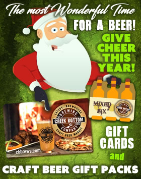 Make someone’s spirits bright with a Creek Bottom Brewing gift card or mixed craft beer gift pack this holiday season! What better way to say ‘Cheers to You and Yours’ than with a gift card for those hard to buy for folks on your Christmas list. Or, choose from lots of craft beers to mix a gift pack that will keep them smiling through the New Year.